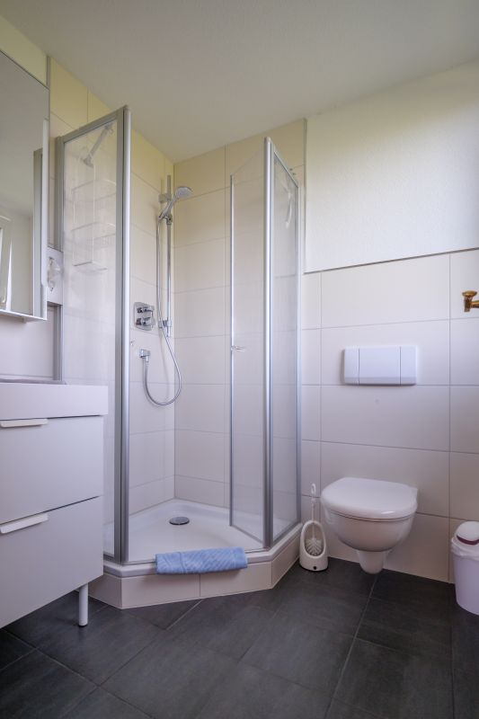 Das Bad der Wohnung hat ein WC und eine Dusche mit Duschkabine, die Dusch- und Handtücher sind selbstverständlich im Mietpreis inkl. und werden wöchentlich getauscht. Die Wohnung hat einen eigenen Eingang und einen reservierten Parkplatz. Benutzung von Waschmaschine und Trockner ist gegen Gebühr möglich.