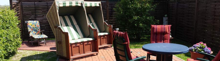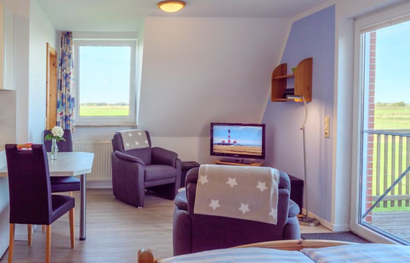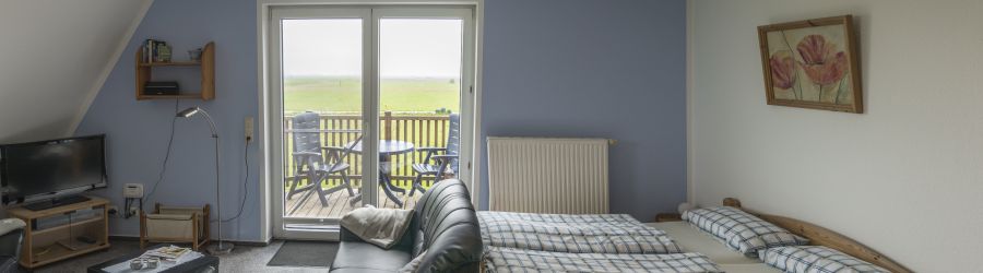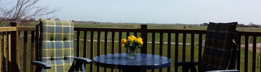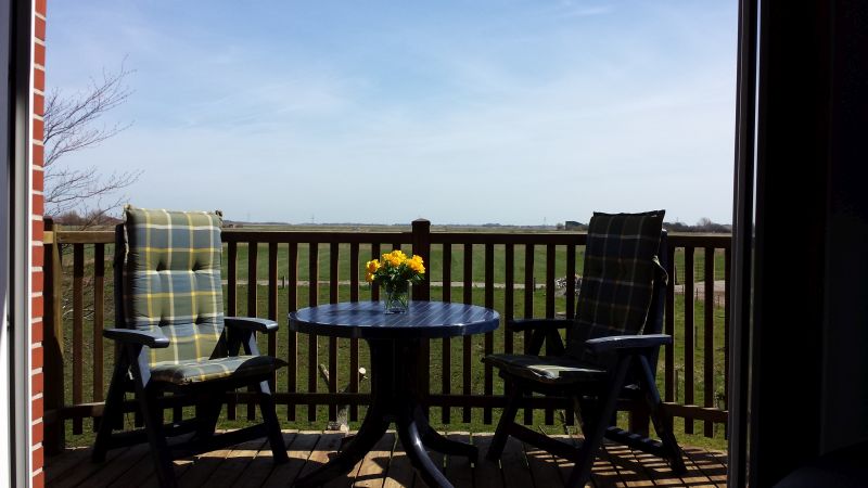 Der Balkon zum Appartement mit Sitzmöbeln und Auflagen und einem freien Blick über die typische Eiderstedter Landschaft.