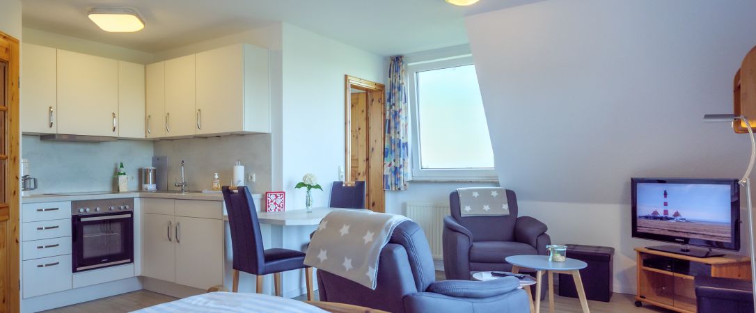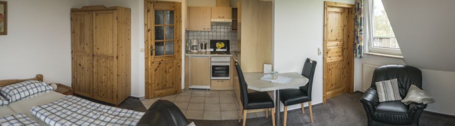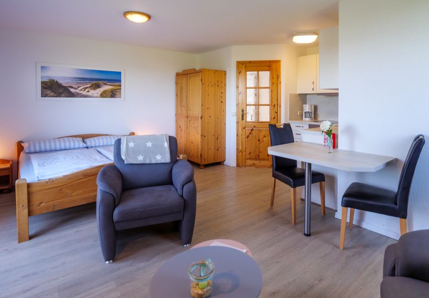 Das ca. 30m² große Appartement liegt im 1. Geschoss. Der Wohnraum ist ausgestattet mit einem Sessel und einem 2er Sofa, 32" Flachbildschirm mit Sat-Anschluß, DVD-Player und Wlan-Radio.