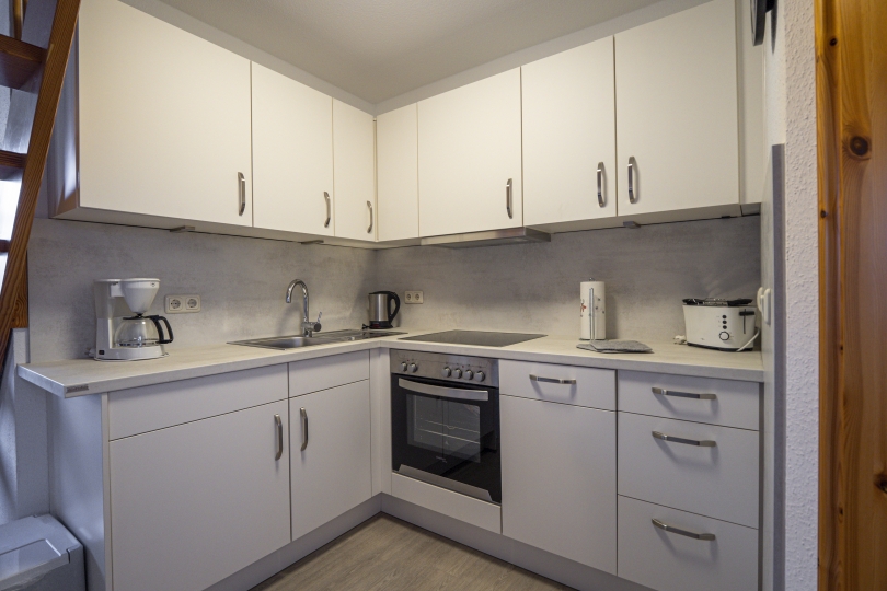Die zum Wohnraum offene Einbauküche ist komplett eingerichtet. Hier finden Sie alles was zum Kochen benötigt wird, vier Plattenherd mit Backofen, Toaster, Wasserkocher, Kaffeemaschine, ausreichend Geschirr.... und den Abwasch erledigt die Geschirrspülmaschine für Sie.