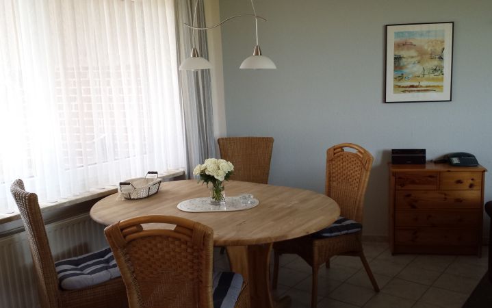 Gemütliche Sitzgruppe für vier Personen und der freie Ausblick aus der Wohnung auf die typischen Eiderstedter Wiesen hinterm Haus.