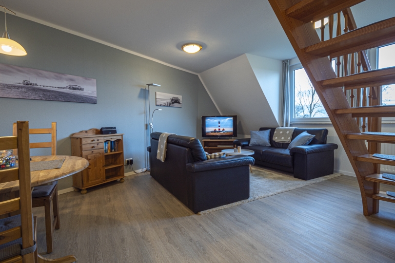 Die ca. 60m² große Wohnung liegt in der 1. Etage. Der Wohnraum ist ausgestattet mit zwei Zweisitzer Sofas. Es gibt einen 40" Flachbildschirm mit Sat-Anschluss und BD-Player, WLAN Radio und kostenlose Internetnutzung über WLAN oder Kabel.