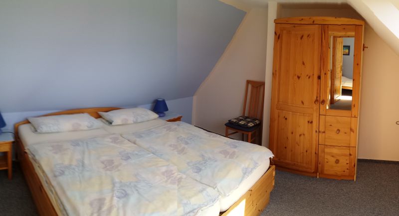Über eine Treppe kommen Sie in die Beiden über dem Wohnraum liegenden abgeschlossenen Schlafräume. Alle Betten sind 2m lang, haben Lattenroste und teilweise verstellbare Kopfteile. Selbstverständlich sind die Betten bei Ihrer Anreise bereits von uns bezogen.